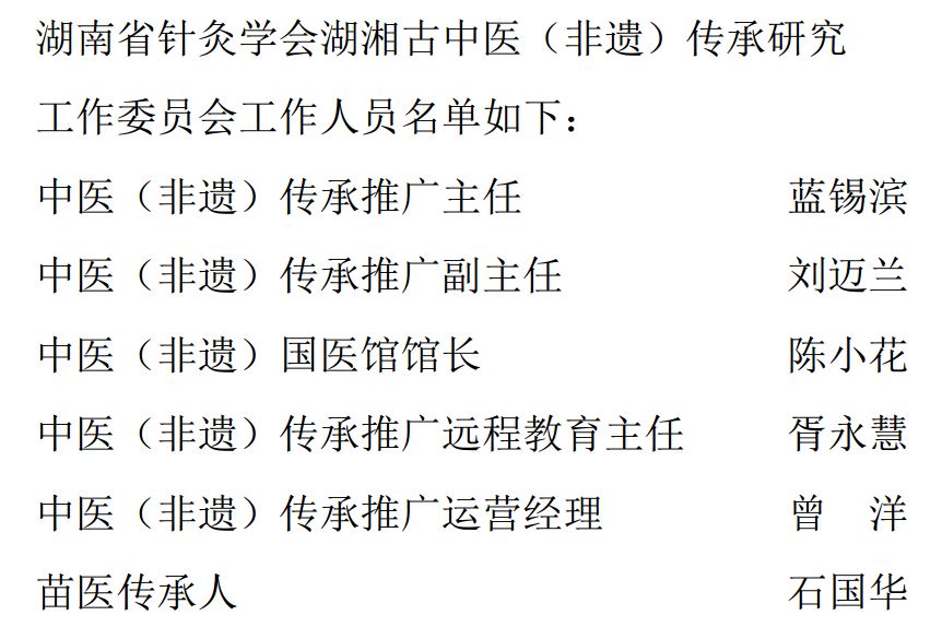 湖南省针灸学会湖湘古中医(非遗)传承研究工作委员会设立日常工作的办事机构和成立工作领导小组,开展湖湘特色古法针灸导引按跷术及方脉的收集、整理;并由湖南湘楚传统医药传承推广中心负责同时展开申遗、传承、推广活动;共同将湖湘古法针灸导引按跷术之精华传承并发扬光大,普及社会、服务百姓,为建设有中医药特色的中国医疗卫生保障体系和人类的健康事业做出贡献!